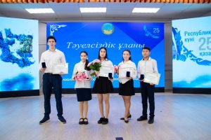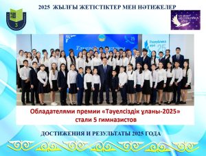 23 октября 2025 года состоялась торжественная церемония награждения лауреатов премии «Тәуелсіздік ұланы» с участием акима Павлодарской области Байханова Асаина Куандыковича, который вручил нагрудные знаки и денежные сертификаты победителям конкурса. Ежегодно премия присуждается 100 школьникам и студентам колледжей, которые отличились в учёбе, науке, искусстве, спорте, социальной активности, волонтёрстве, совершили общественно значимые поступки и даже проявили героизм. В этом году обладателями премии стали пять гимназистов. В номинации «Научно – техническое творчество и учебно – исследовательская деятельность» — ученики 11″М» класса Мастобаев Никита и Мукашева Томирис, ученик 7 «А» класса Мұқұш Алмаз и ученица 6 «И» класса Куспекова Томирис. В номинации «Социально-значимая и общественная деятельность» премии удостоена ученица 11 «И» класса Тлеубаева Дайана. Выражаем благодарность акиму Павлодарской области Байханову Асаину Куандыковичу за поддержу талантливой молодежи!