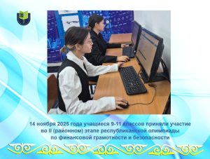 14 ноября 2025 года учащиеся 9-11 классов приняли участие во II (районном) этапе республиканской олимпиады по финансовой грамотности и безопасности. Эта олимпиада проводится в канун Дня национальной валюты — тенге и профессионального праздника работников финансовой системы страны, который отмечают в Казахстане ежегодно 15 ноября. Особый интерес вызвала олимпиада у старшеклассников, которые планируют связать свое будущее с финансовой деятельностью