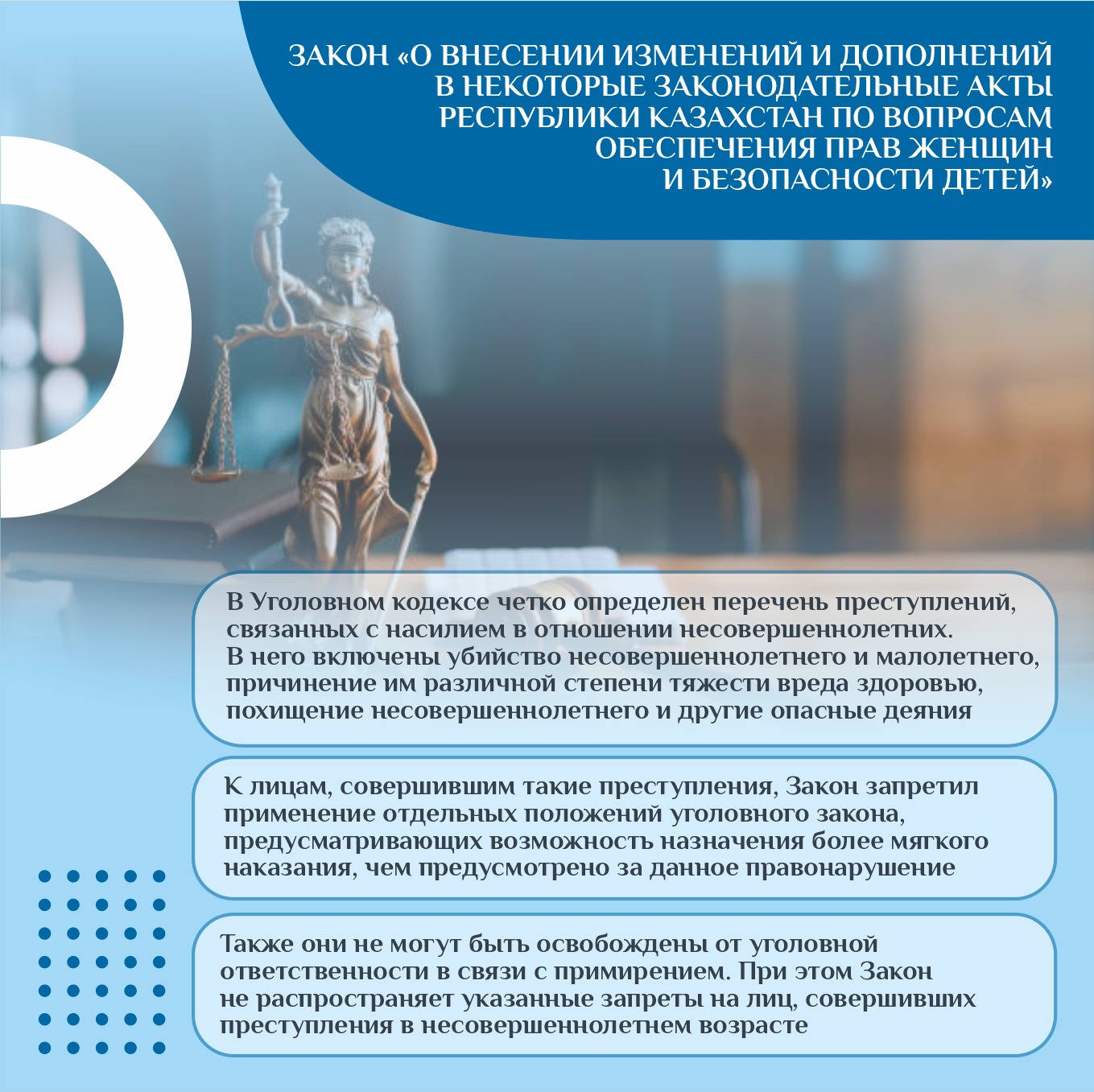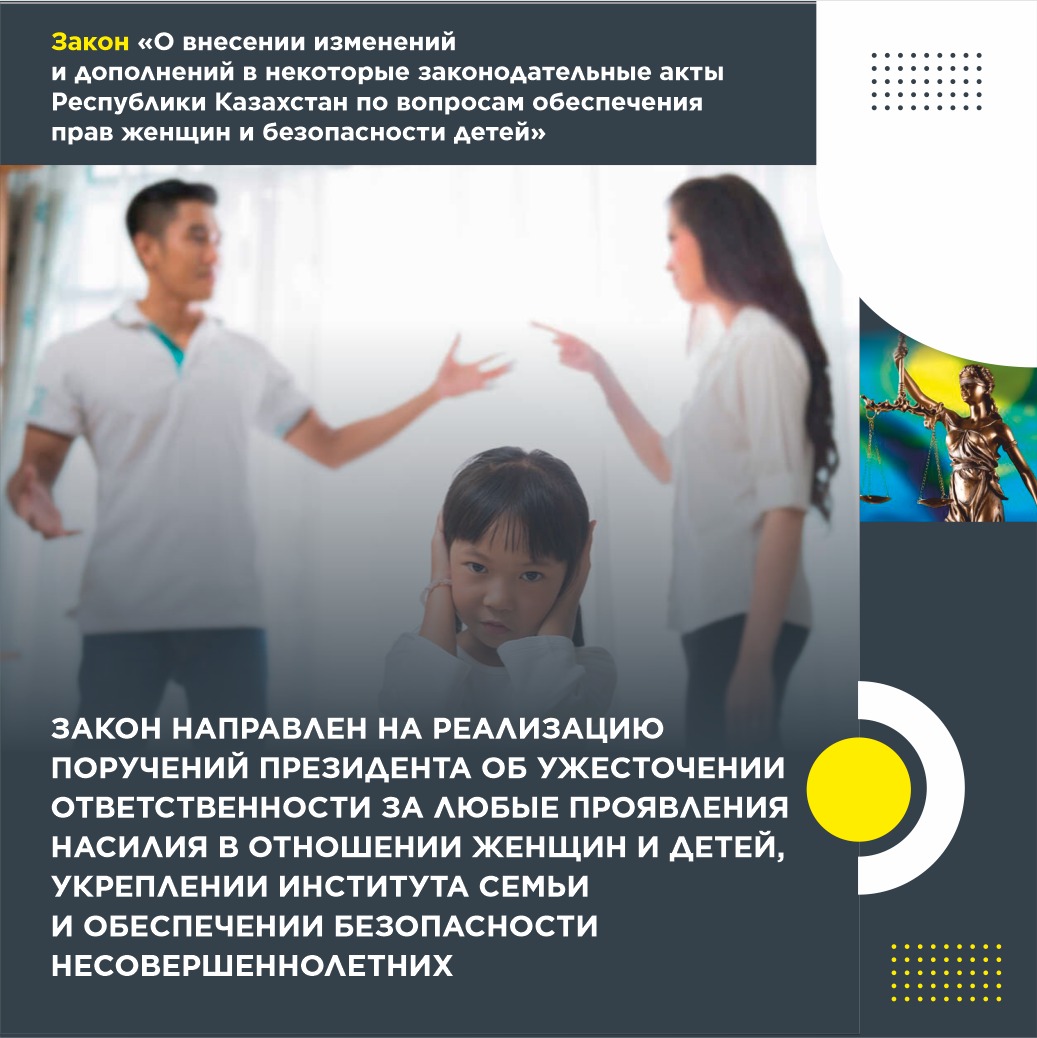 Мемлекет басшысы 2022 жылғы 16 наурыздағы және 2023 жылғы 1 қыркүйектегі Қазақстан халқына арнаған жолдауларында әйелдер мен балаларға қатысты зорлық-зомбылық үшін жазаны қатаңдатуды тапсырғанын еске сала кетейік.